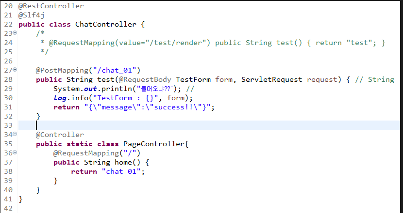 Server(Controller) 단 입니다.@RestController 어노테이션을 이용하여 기본적으로 통신만 주고받게 했고 처음에 화면을 띄우기 위해 PageController는 @Controller로 어노테이션을 걸어줬습니다.