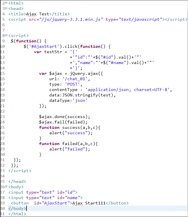 button을 만들어서 button을 클릭 시 testStr의 제이슨 형태의 타입의 데이터가 ajax통신을 이용하여 서버(Controller) 단으로 데이터를 보내는 예제입니다.