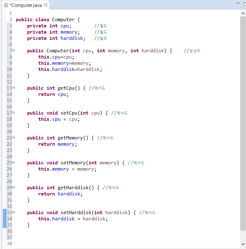 위 그림의 Computer 클래스는 가장 기본이 되는 클래스이며 필드와 생성자 메서드로 구성이 되어 있다.