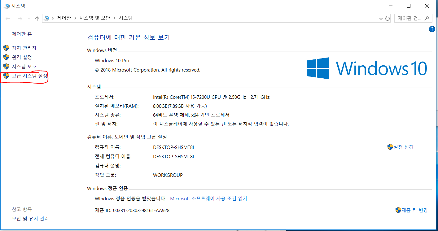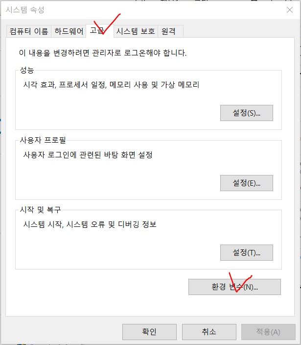고급 시스템 설정에 들어가서 고급 탭을 누르고 환경변수를 클릭합니다.