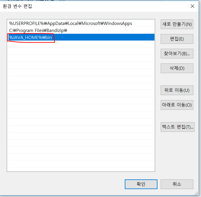 확인을 누르고 밑에 처럼 JAVA_HOME 시스템 변수의 PATH만 잡아주면 끝이다.